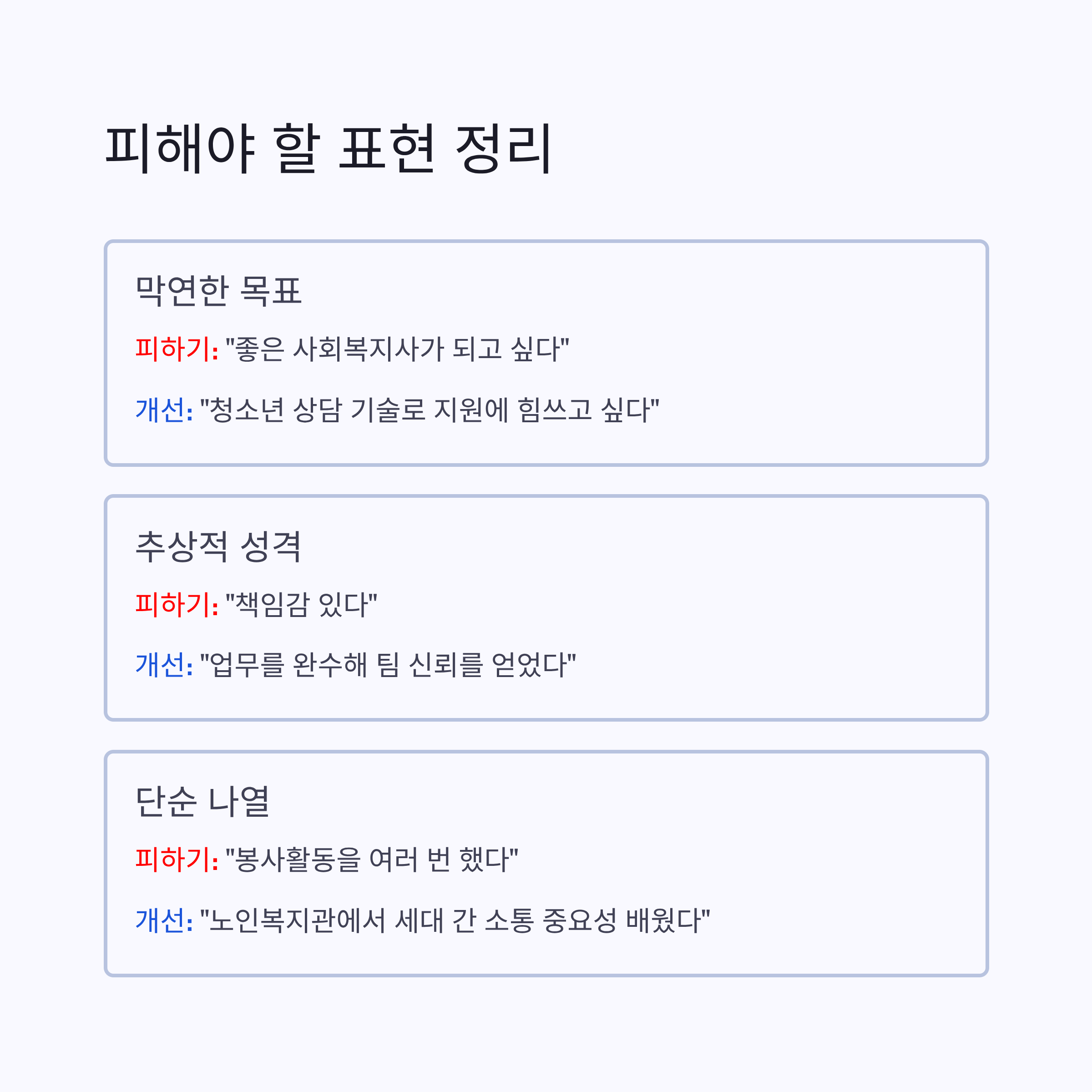 | 단순 나열 | "봉사활동을 여러 번 했다" | "노인 복지관 봉사 경험을 통해 세대 간 소통의 중요성을 배웠다" |