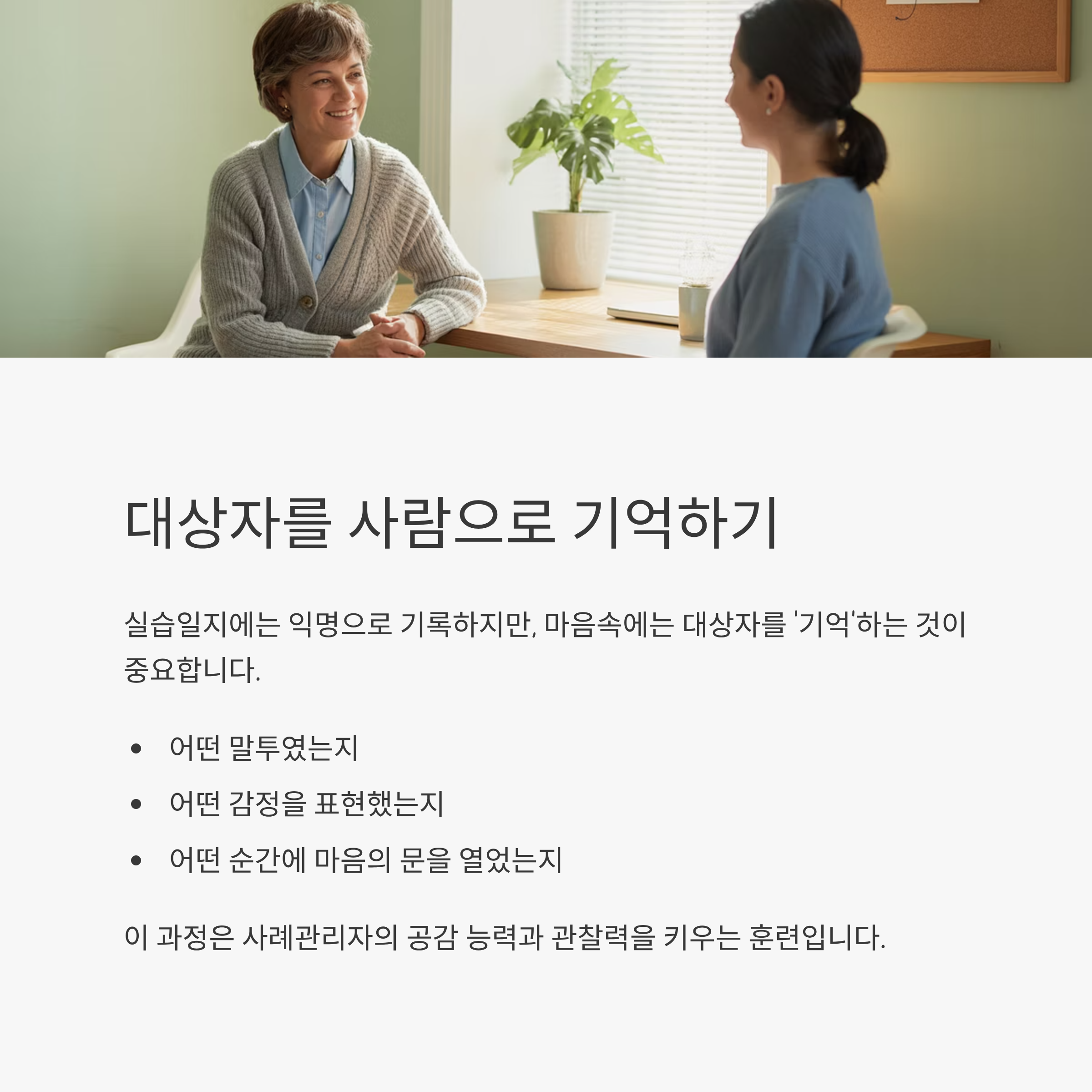 이 과정은 사례관리자의 공감 능력과 관찰력을 키우는 훈련이자, 나중에 실무에 큰 자산이 됩니다.