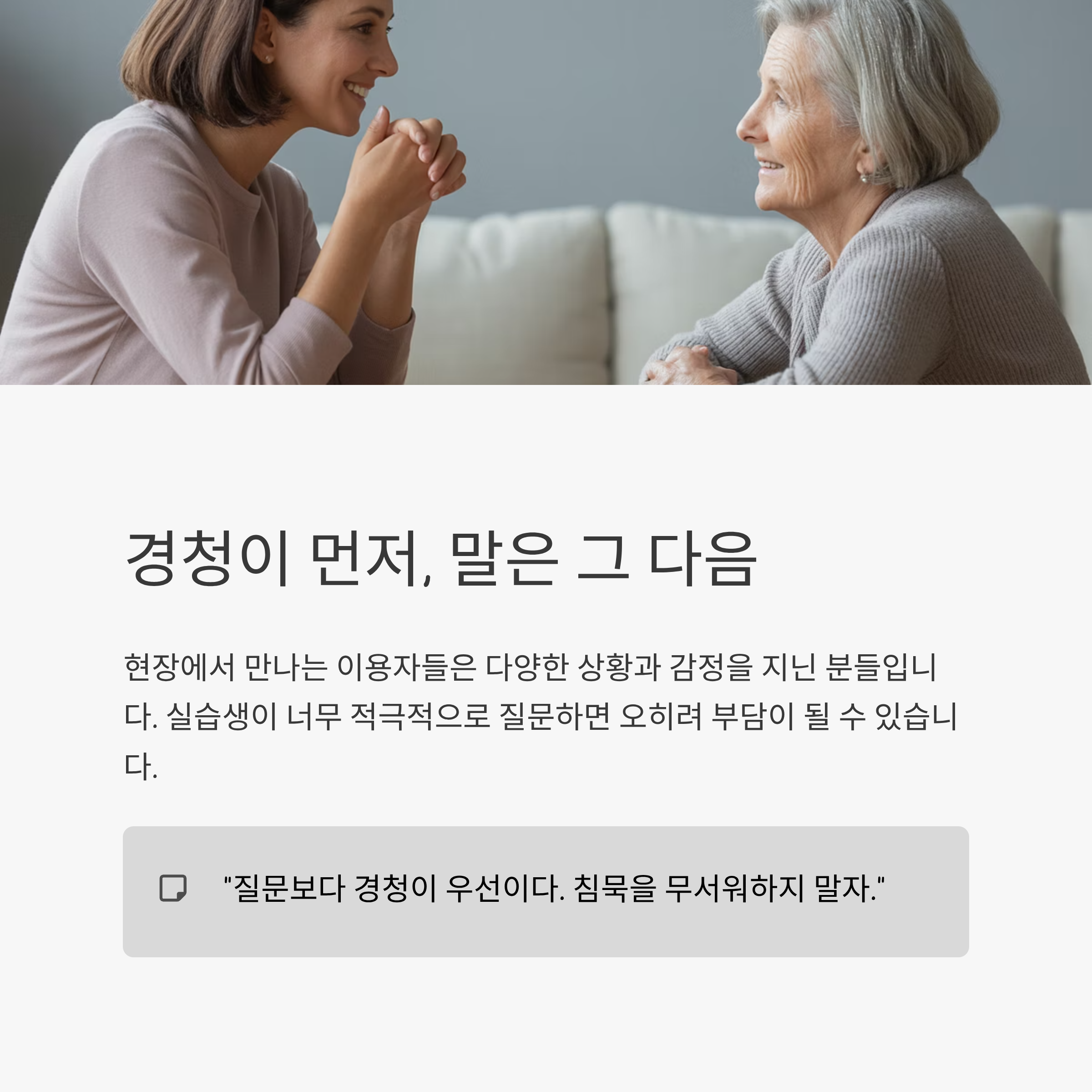 현장에서 만나는 이용자들은 다양한 상황과 감정을 지닌 분들입니다. 실습생이 너무 적극적으로 질문하거나 말을 많이 하면 오히려 부담이 될 수 있습니다.