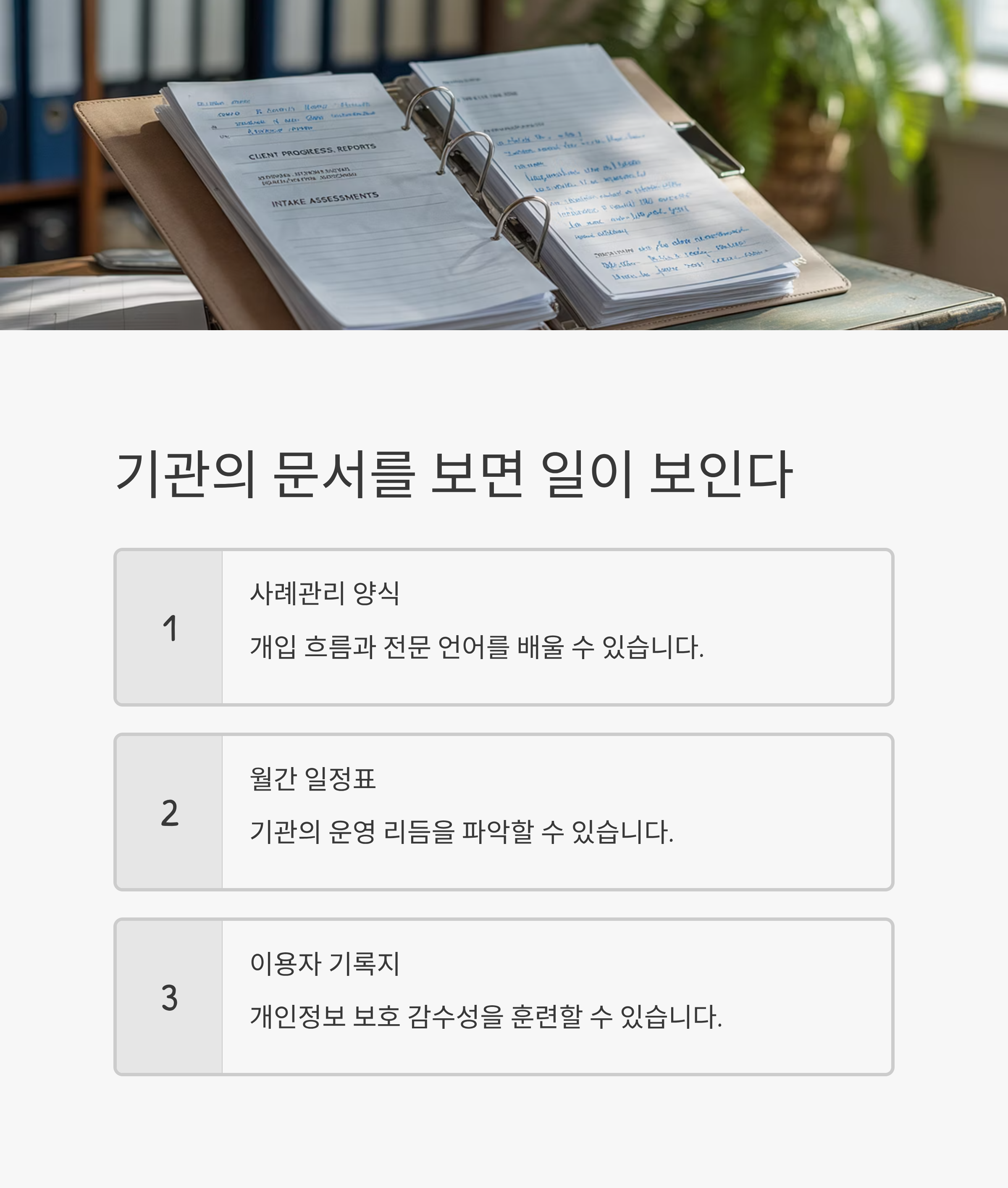 실습 기관에서 활용하는 회의록, 사업계획서, 프로그램 매뉴얼 등을 살펴보면 단순한 보조 역할 이상으로 현장을 이해하는 데 큰 도움이 됩니다.