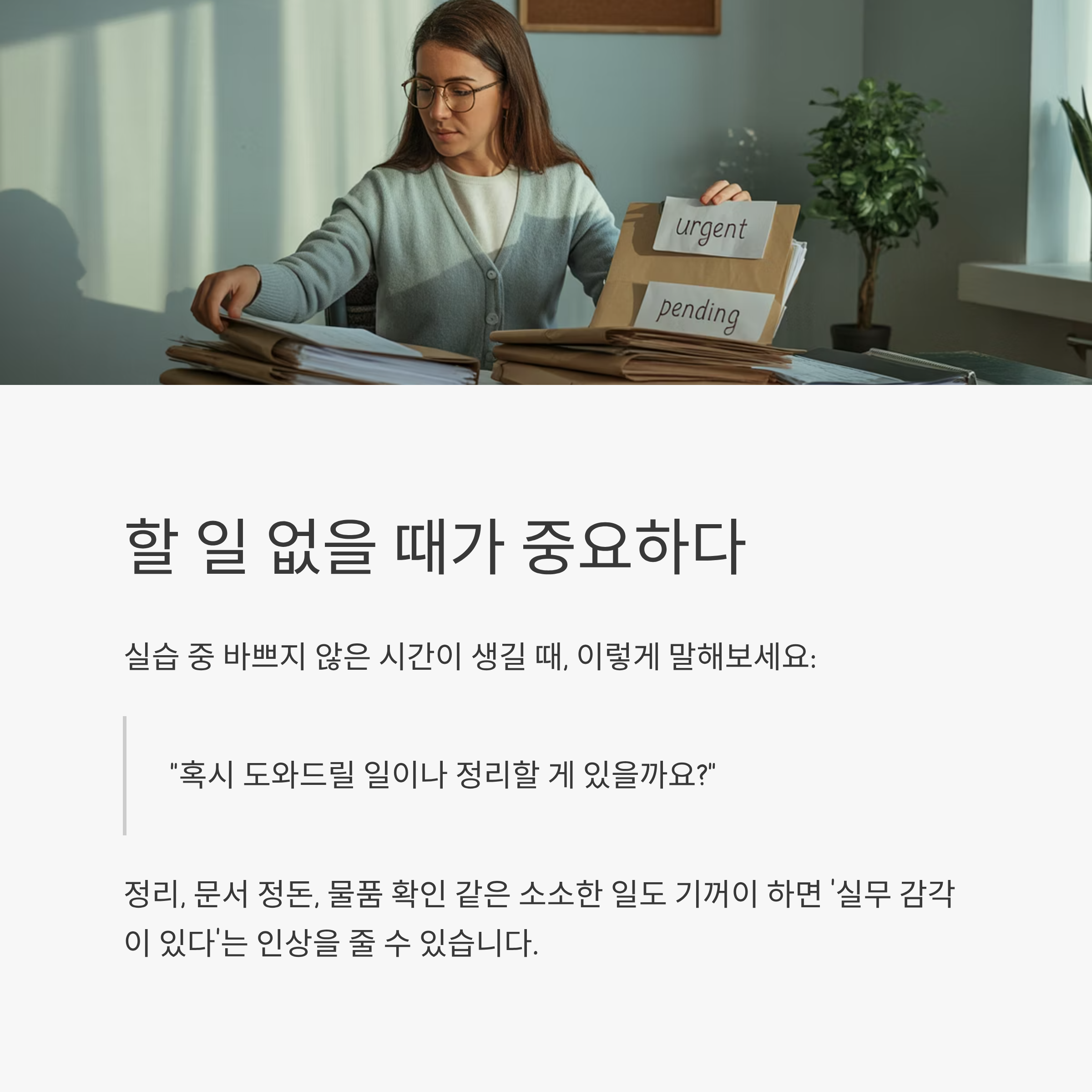 이 한 마디가 실습생의 태도를 완전히 다르게 보이게 합니다. 특히 정리, 문서 정돈, 물품 확인 같은 소소한 일도 기꺼이 하면 ‘실무 감각이 있다’는 인상을 줄 수 있습니다.