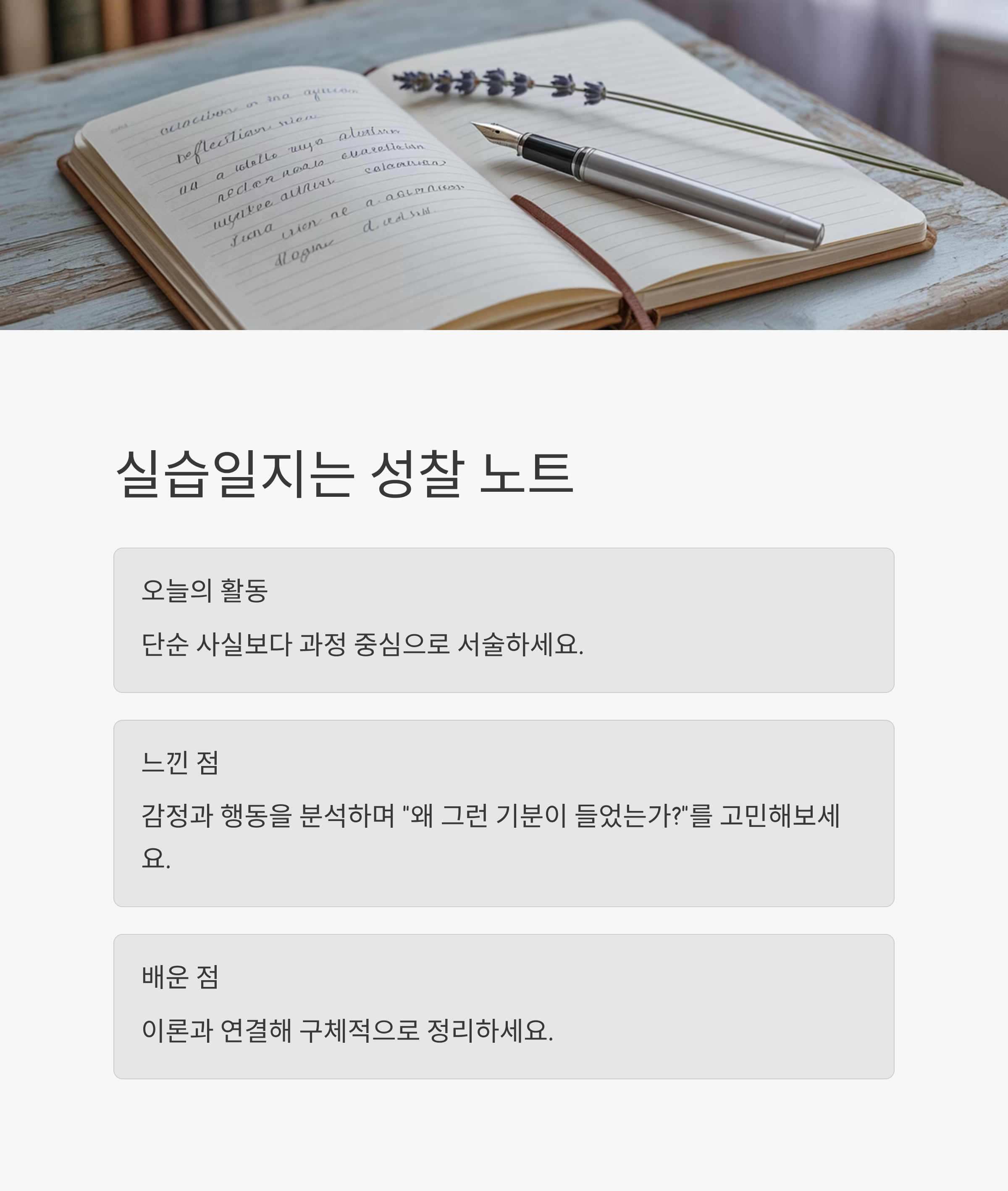 많은 실습생들이 실습일지를 ‘검사를 위한 숙제’처럼 여기지만, 일지를 잘 쓰는 습관은 전문성을 키우는 핵심 훈련입니다.