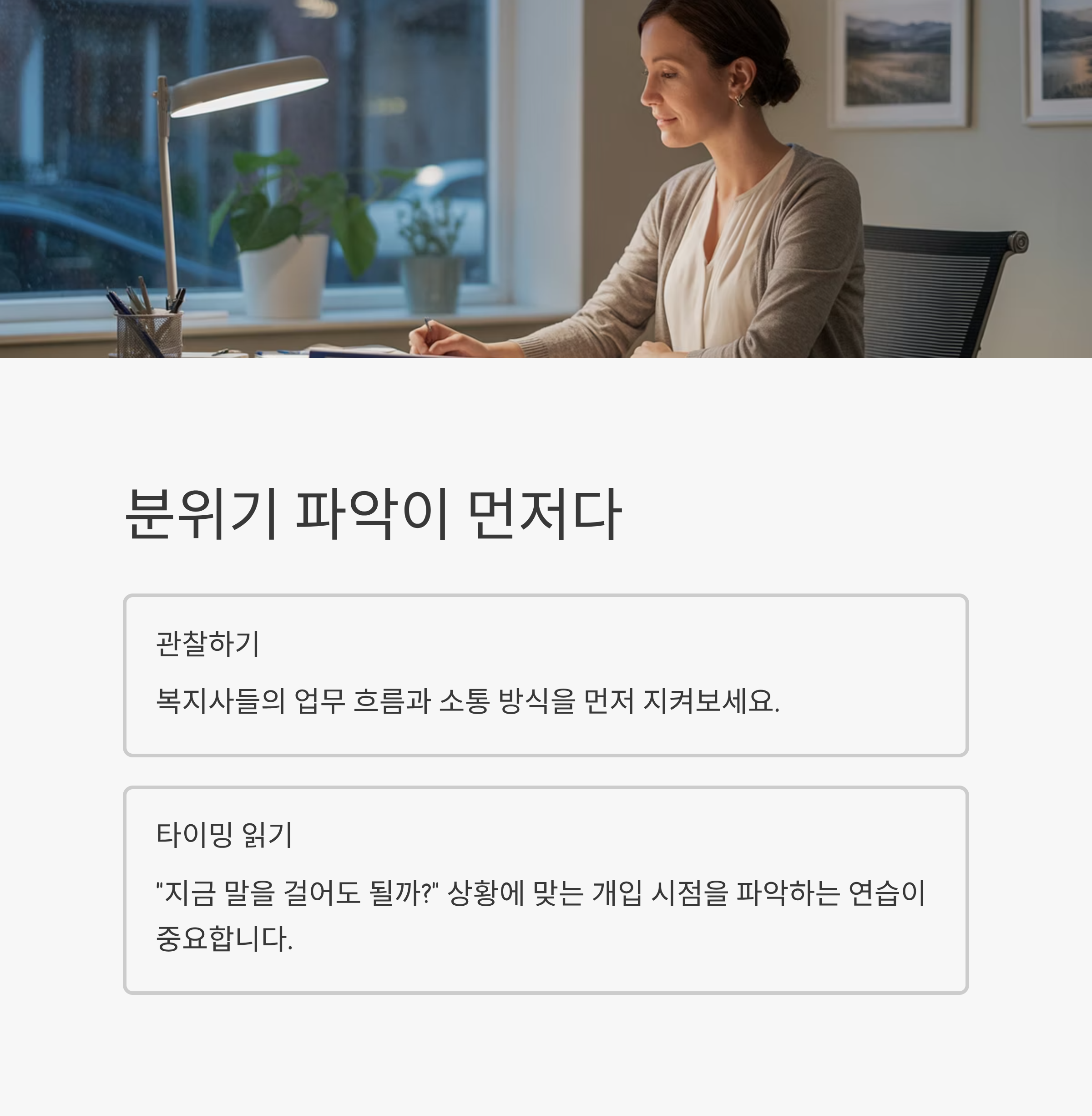 "지금 말을 걸어도 될까?", "이 상황에서 어떤 도움을 줄 수 있을까?"를 계속 관찰하며 스스로 타이밍을 읽는 연습을 해보세요. 이는 사회복지 실무에서 꼭 필요한 ‘관계 형성의 기술’이기도 합니다.