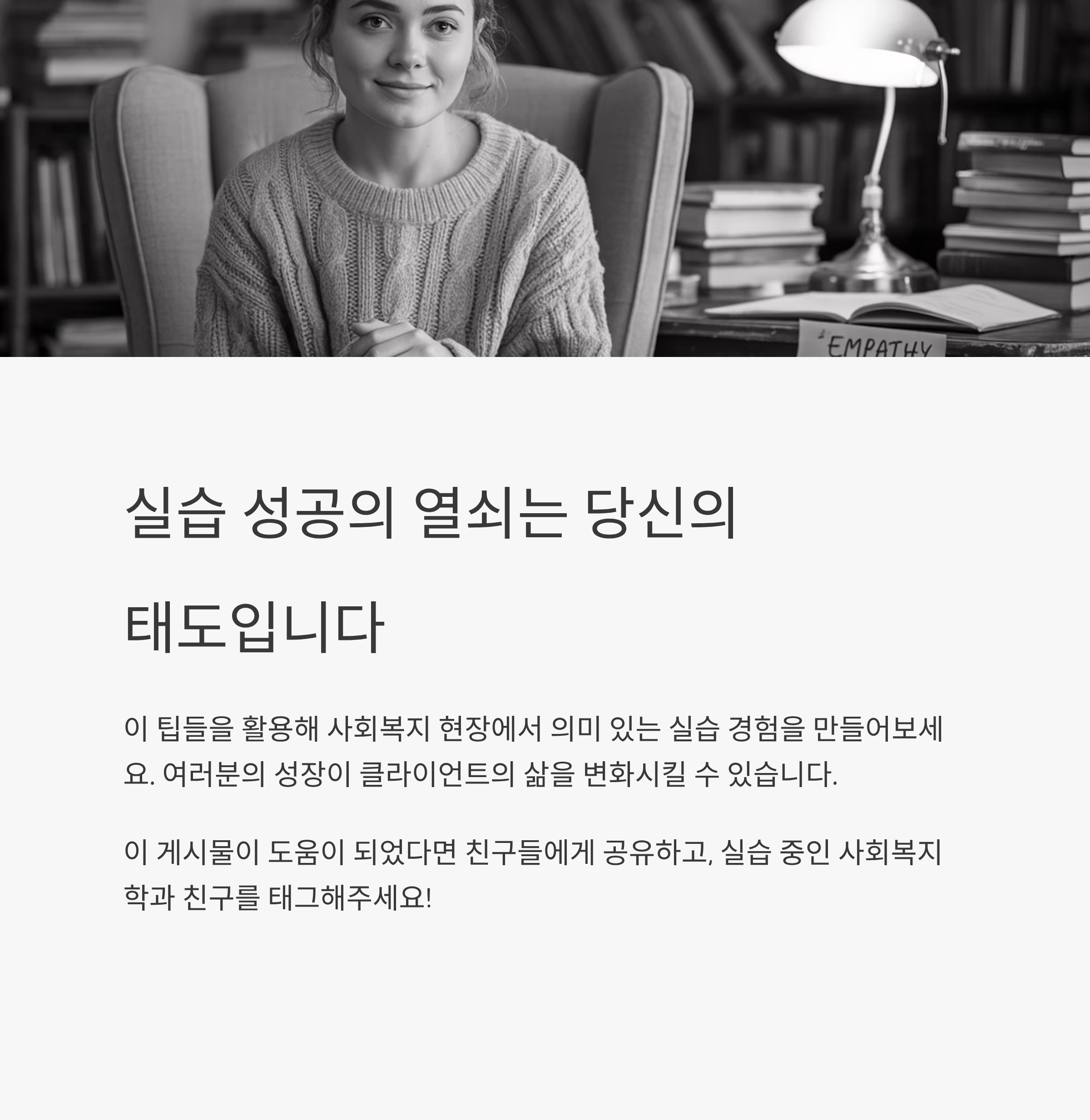 사회복지 실습은 학교에서 배운 이론을 실제 현장에 적용해 보는 중요한 시기입니다. 그러나 막상 실습에 들어가면 무엇을 준비해야 할지, 어떻게 행동해야 할지 막막한 경우가 많습니다. 이 글에서는 GPT가 알려주는 사회복지 실습생을 위한 현장 꿀팁을 통해, 실습을 더 의미 있고 알차게 만드는 방법을 소개합니다. 실제로 적용 가능한 팁만 엄선하여 담았으니 실습을 앞둔 학생이라면 꼭 읽어보시길 바랍니다.