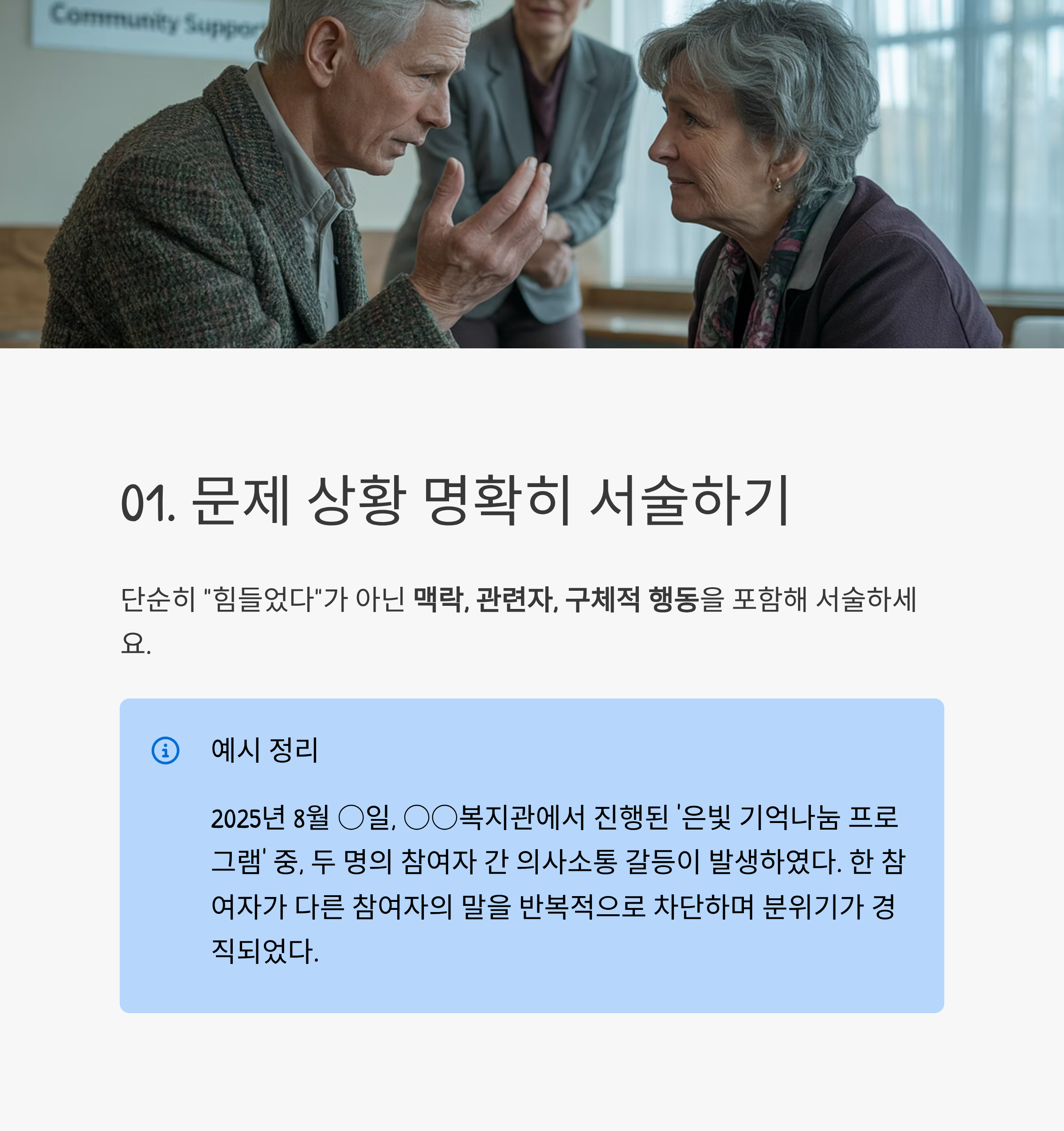 | 문제 상황 | 노인 프로그램 중 참여자 간 갈등 발생 |