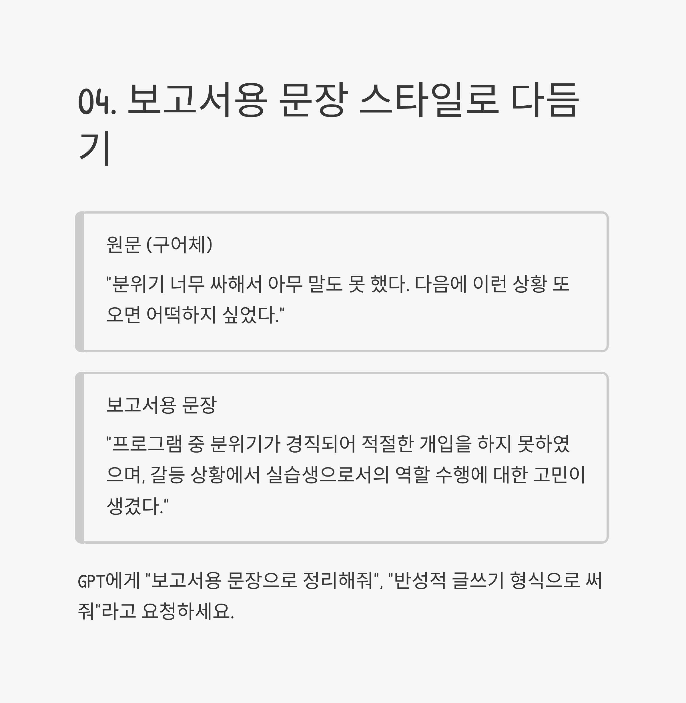 GPT에게 "보고서용 문장으로 정리해 줘", "반성적 글쓰기 형식으로 써줘"라고 지시하면