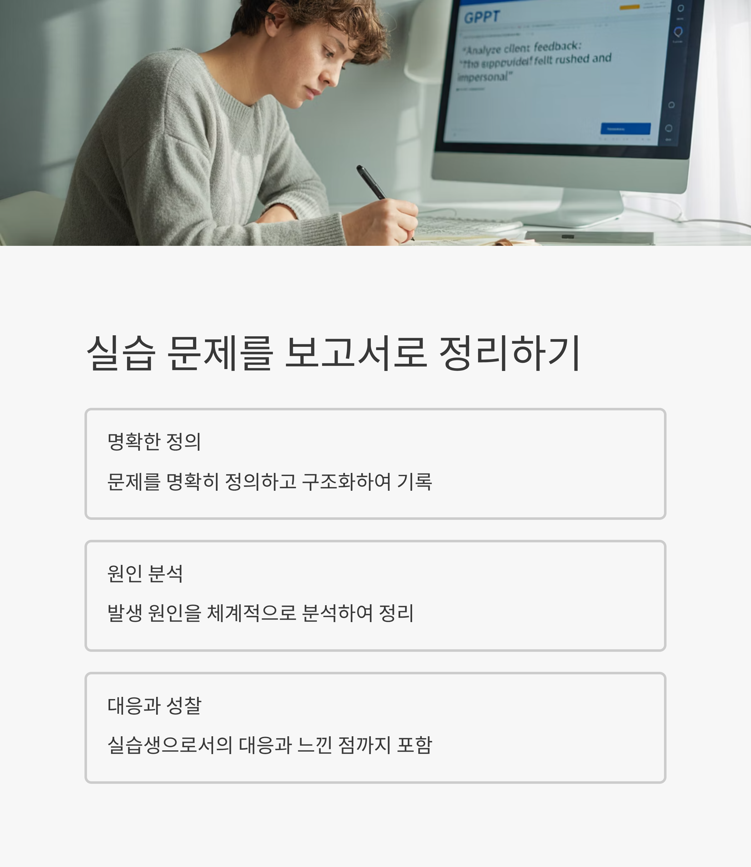 실습생으로서의 대응과 느낀 점까지 정리하는 것이 핵심입니다.