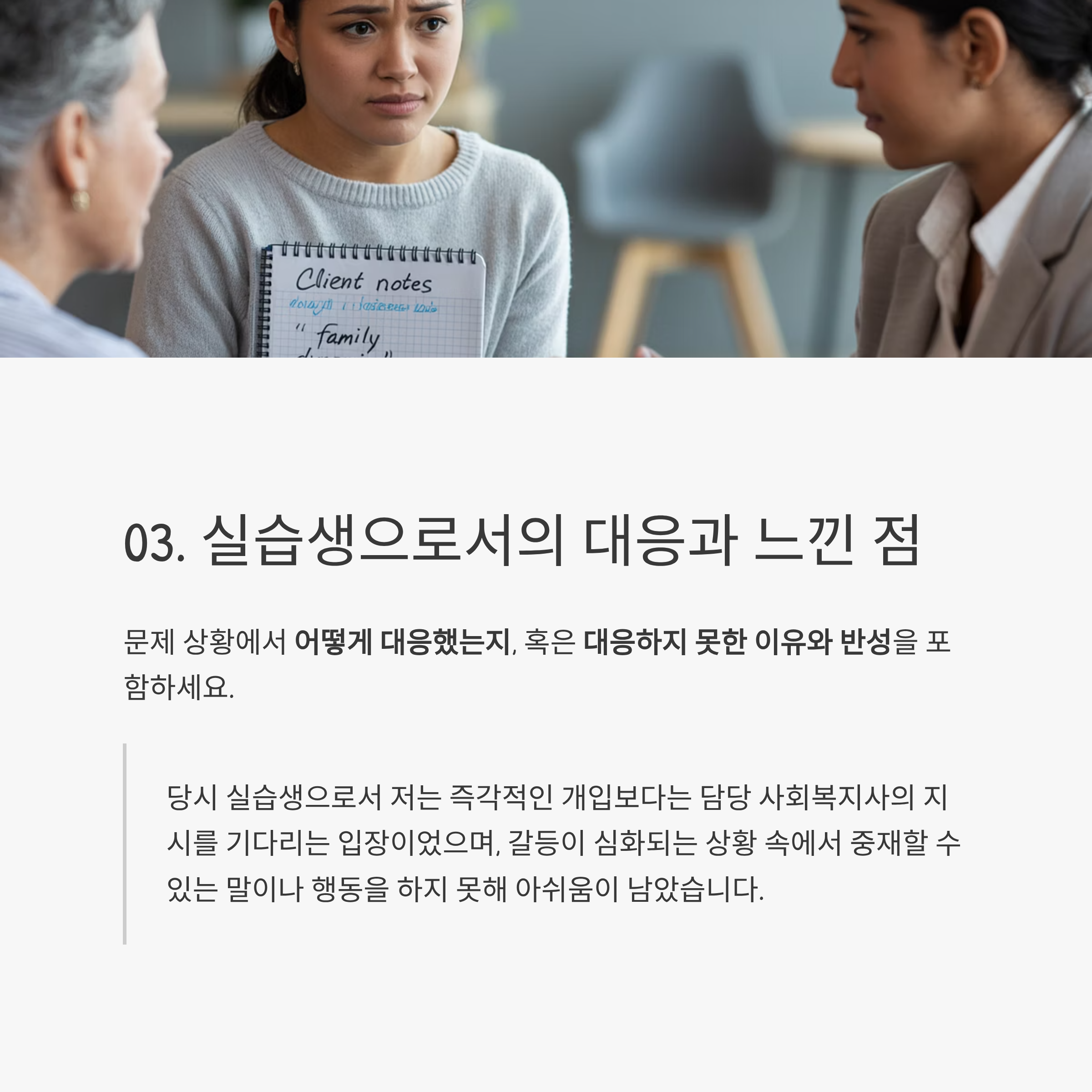 당시 실습생으로서 저는 즉각적인 개입보다는 담당 사회복지사의 지시를 기다리는 입장이었으며,
