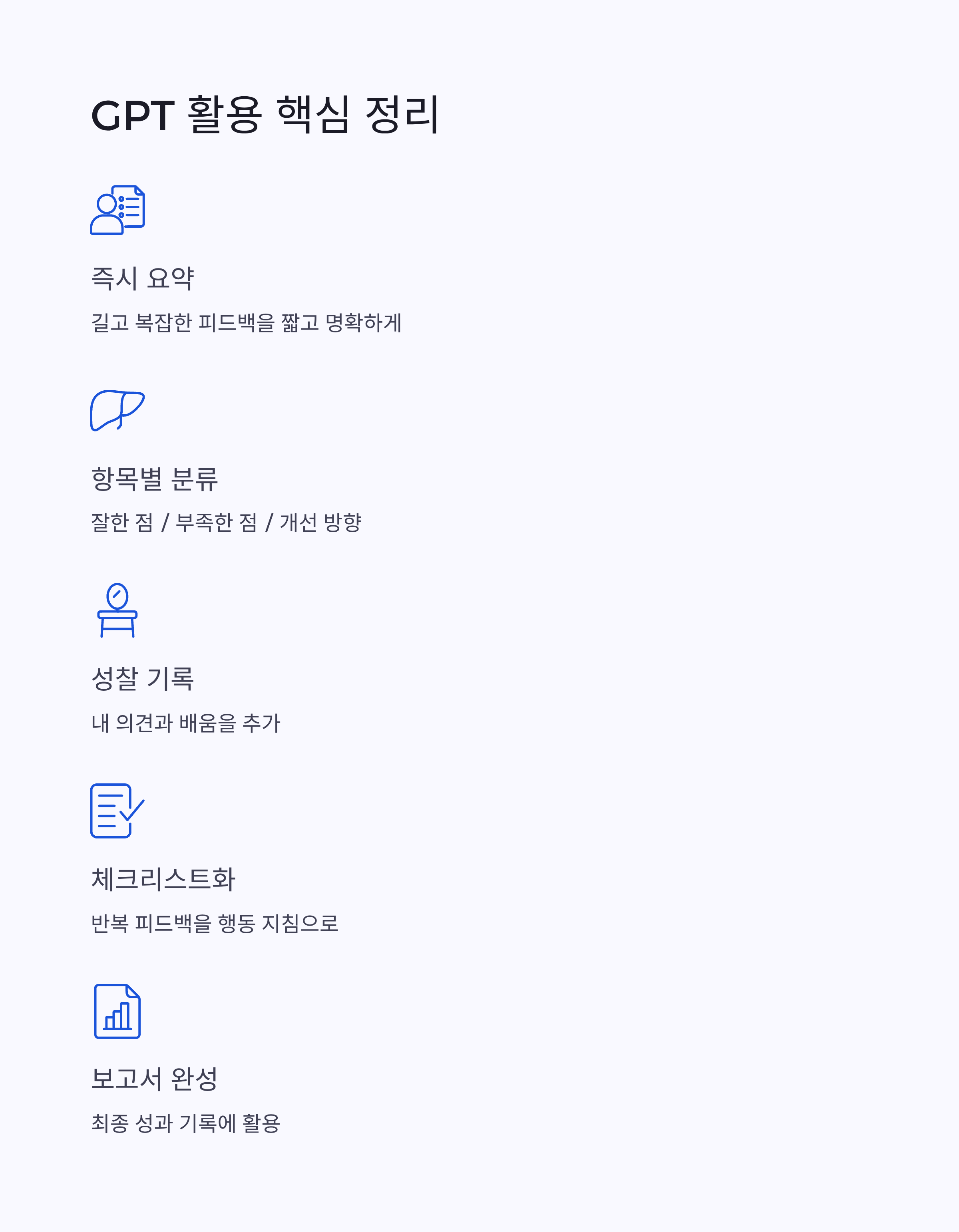 GPT에게 “이 피드백들을 토대로 개선 체크리스트 만들어줘”라고 하면 이렇게 정리할 수 있습니다.