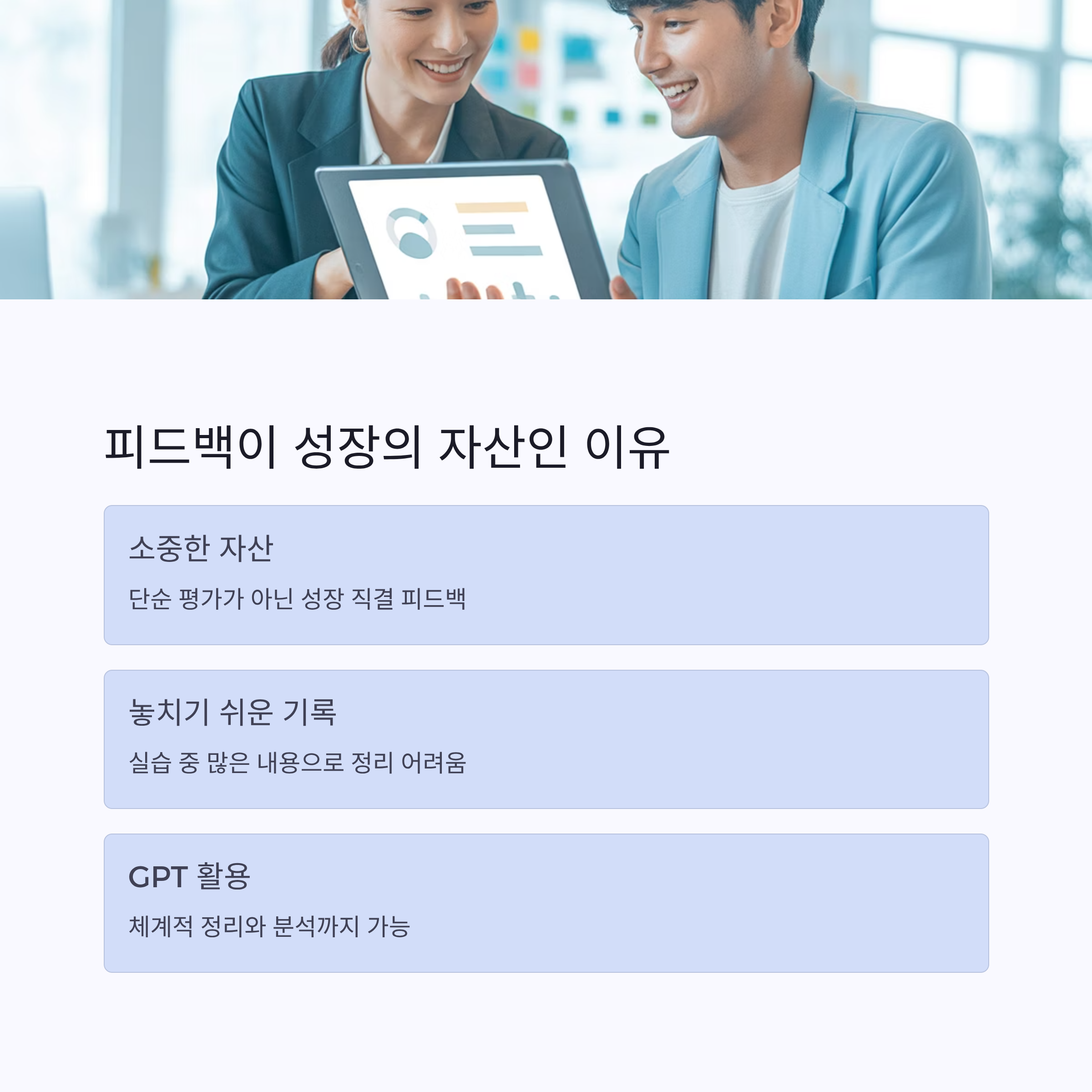 이제는 피드백이 두렵지 않고, 나를 성장시키는 자산으로 쌓일 거예요.