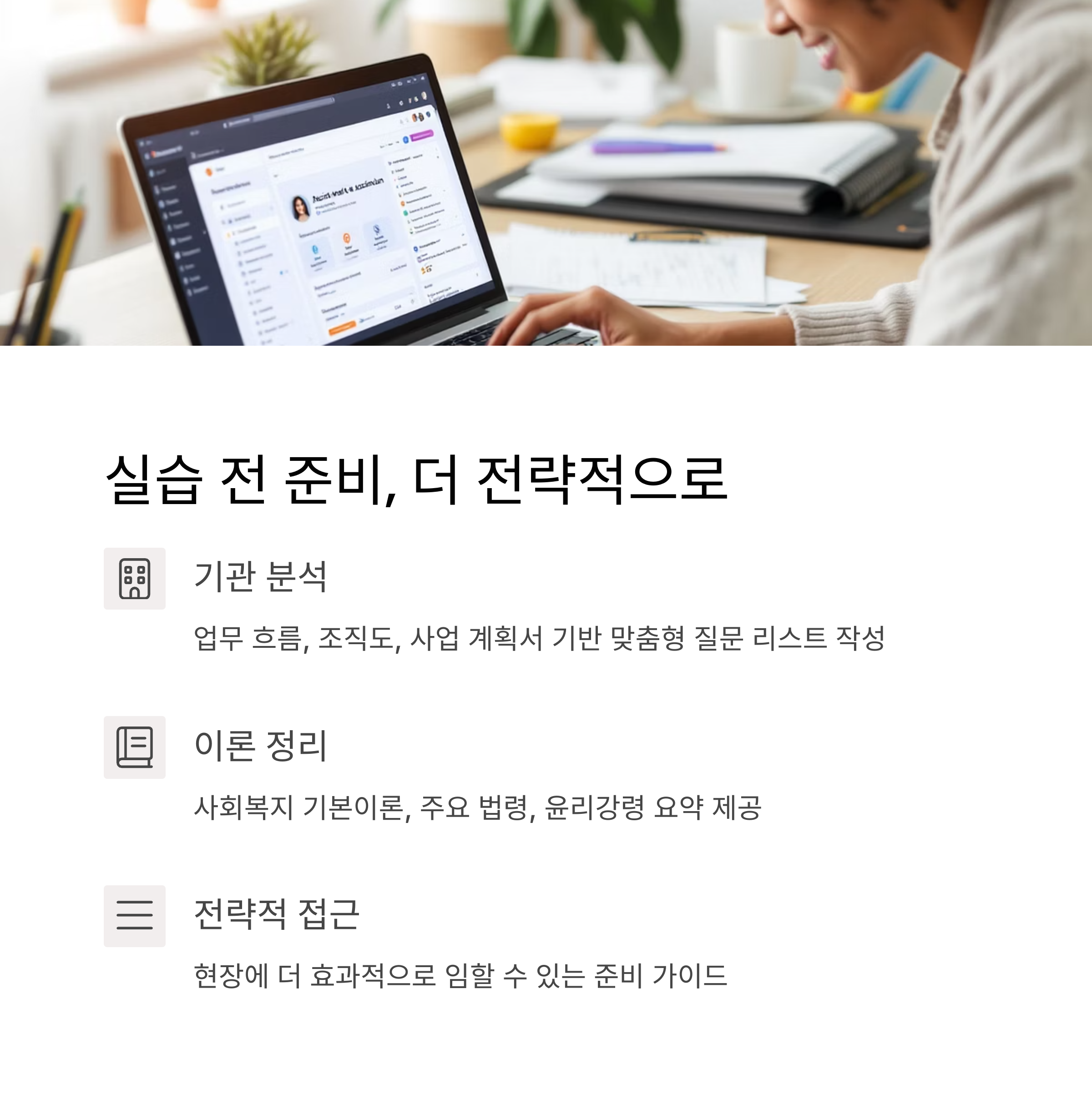 | 실습기관 평가 양식 정리 | 현장 기관 기준에 맞춘 문서 초안 제공 |