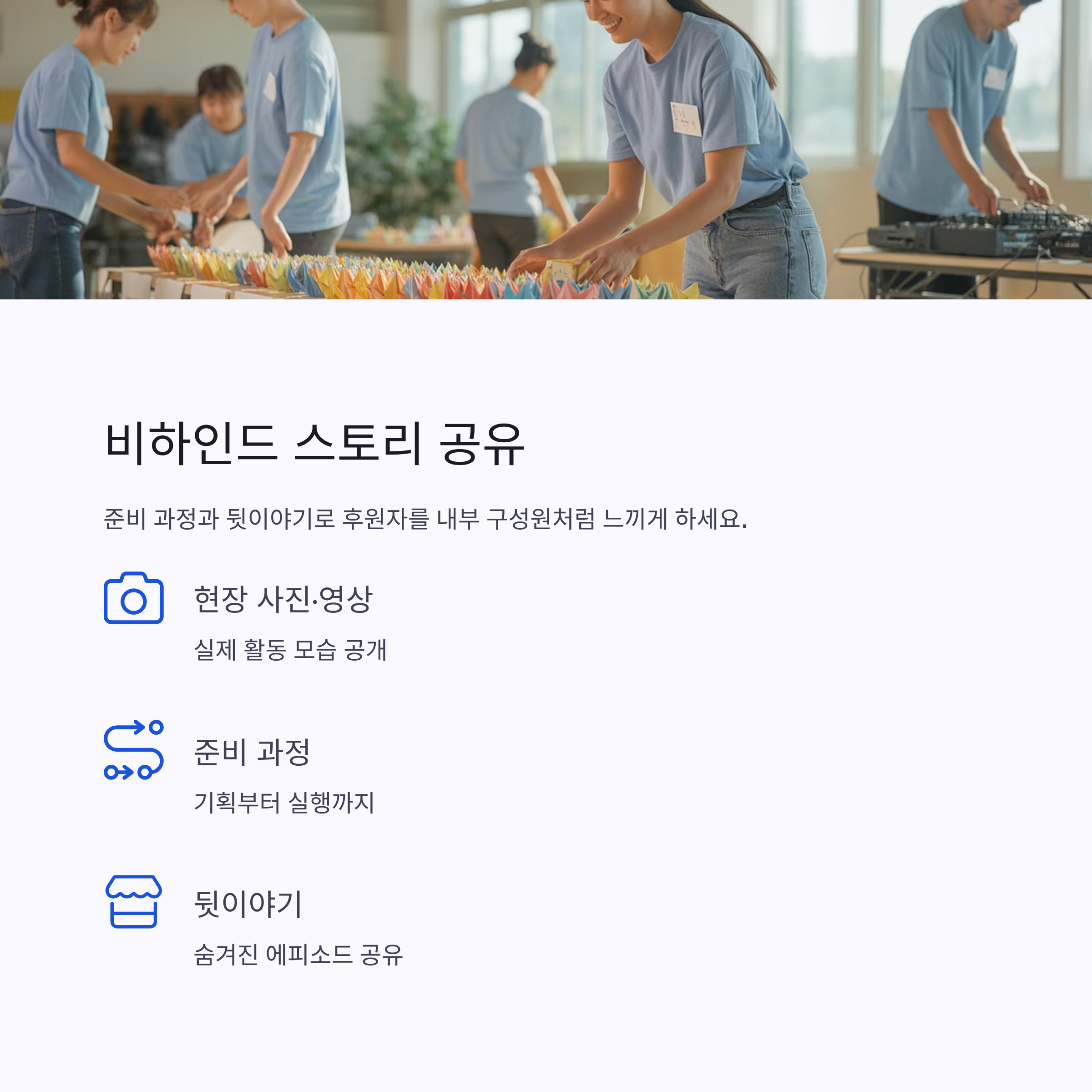 현장 사진, 영상뿐 아니라 준비 과정이나 뒷이야기를 공유하면 후원자가 단순한 외부인이 아니라 내부 구성원처럼 느낄 수 있어요. ‘이 과정에 내가 도움을 주고 있구나’라는 감각을 심어주는 게 중요하죠.