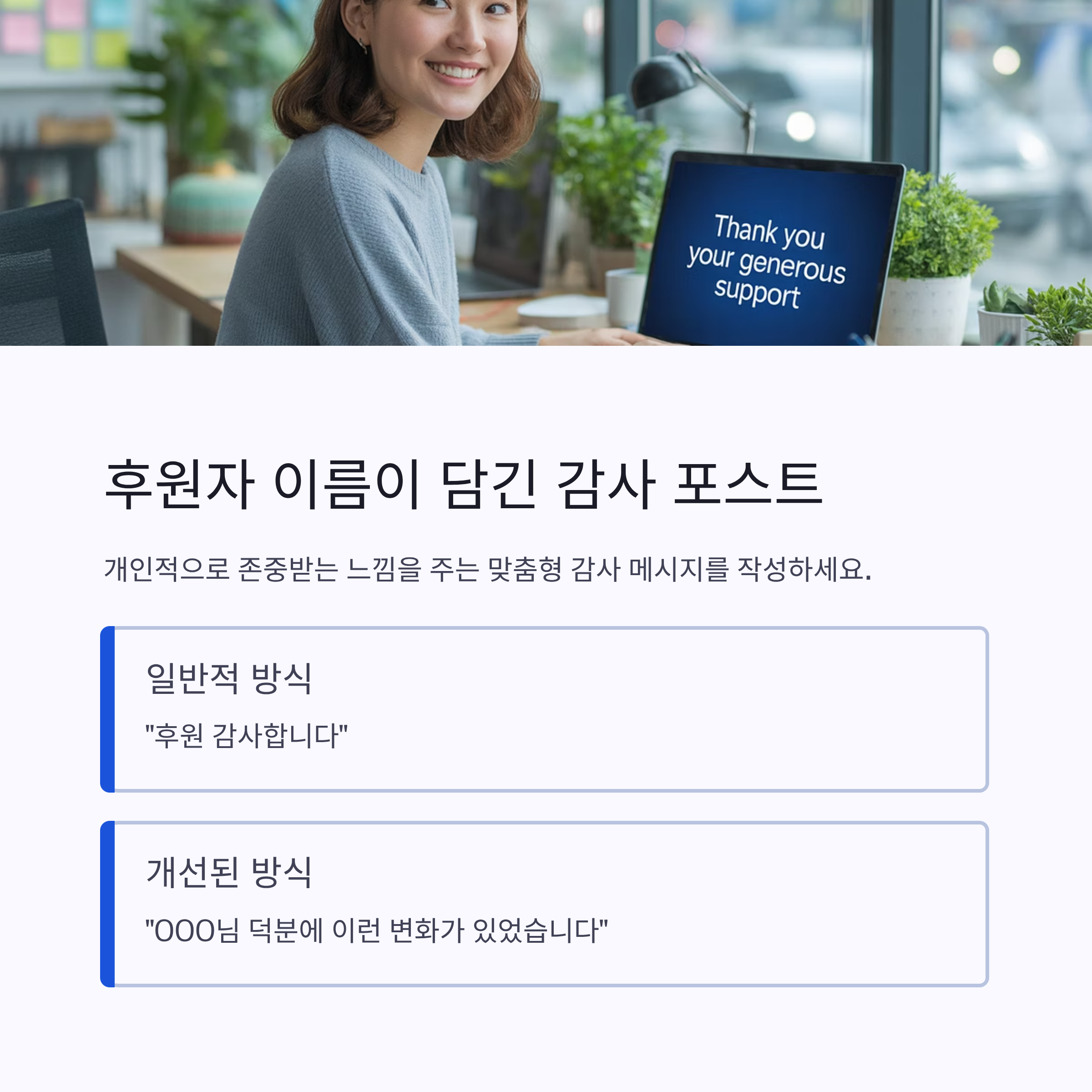 단순히 “후원 감사합니다”라고 하는 것보다 실제 후원자의 이름이나 참여 내역을 언급하면 개인적으로 존중받는 느낌을 줄 수 있어요. 예를 들어 “이번 캠페인에 참여해 주신 OOO님 덕분에 이런 변화가 있었습니다”라는 식이죠.