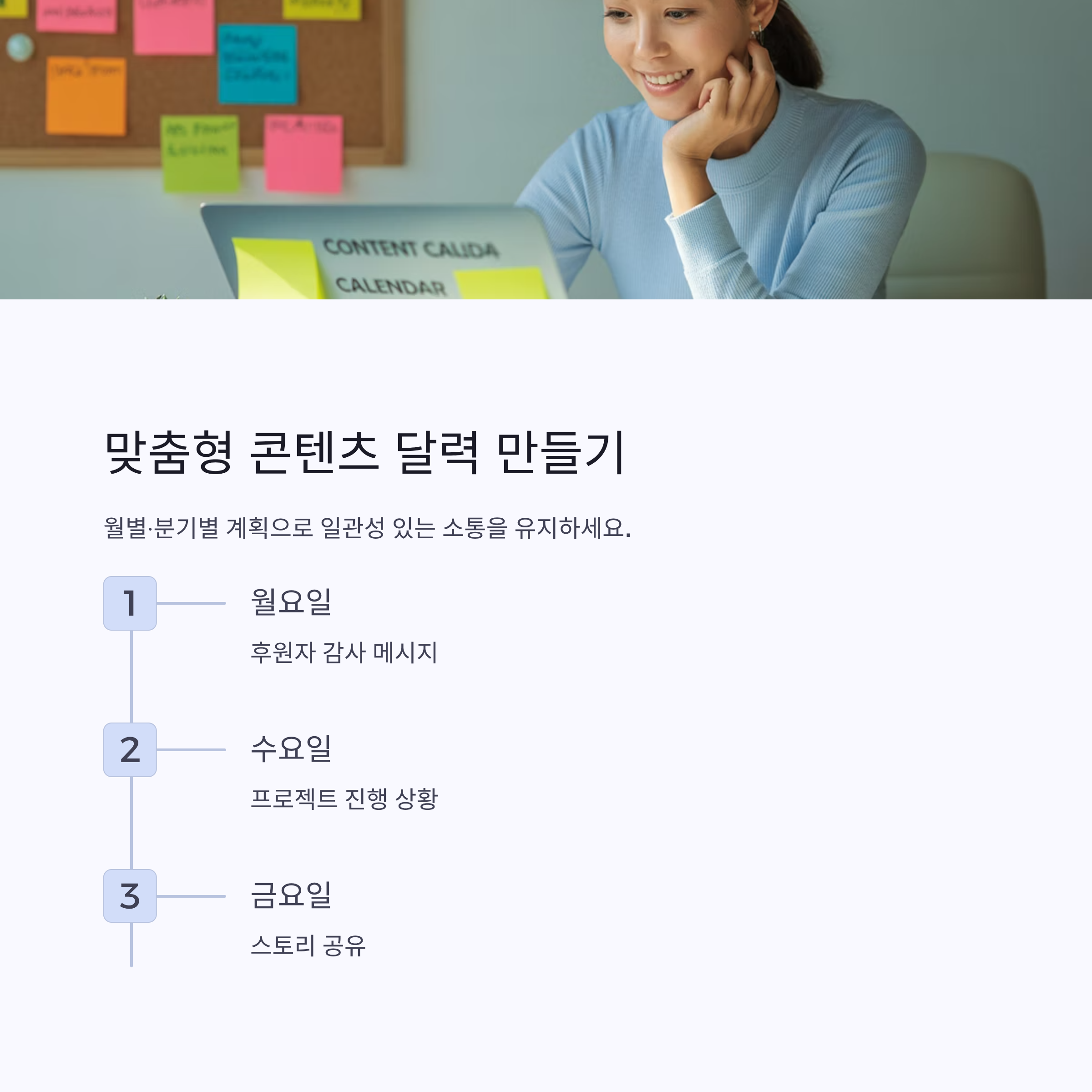 월별 혹은 분기별로 콘텐츠 달력을 만들어 주제와 업로드 시점을 미리 계획하면 좋아요. 예를 들어 매주 월요일은 ‘후원자 감사 메시지’, 수요일은 ‘프로젝트 진행 상황’, 금요일은 ‘스토리 공유’ 등으로 정하면 일관성을 유지할 수 있어요.