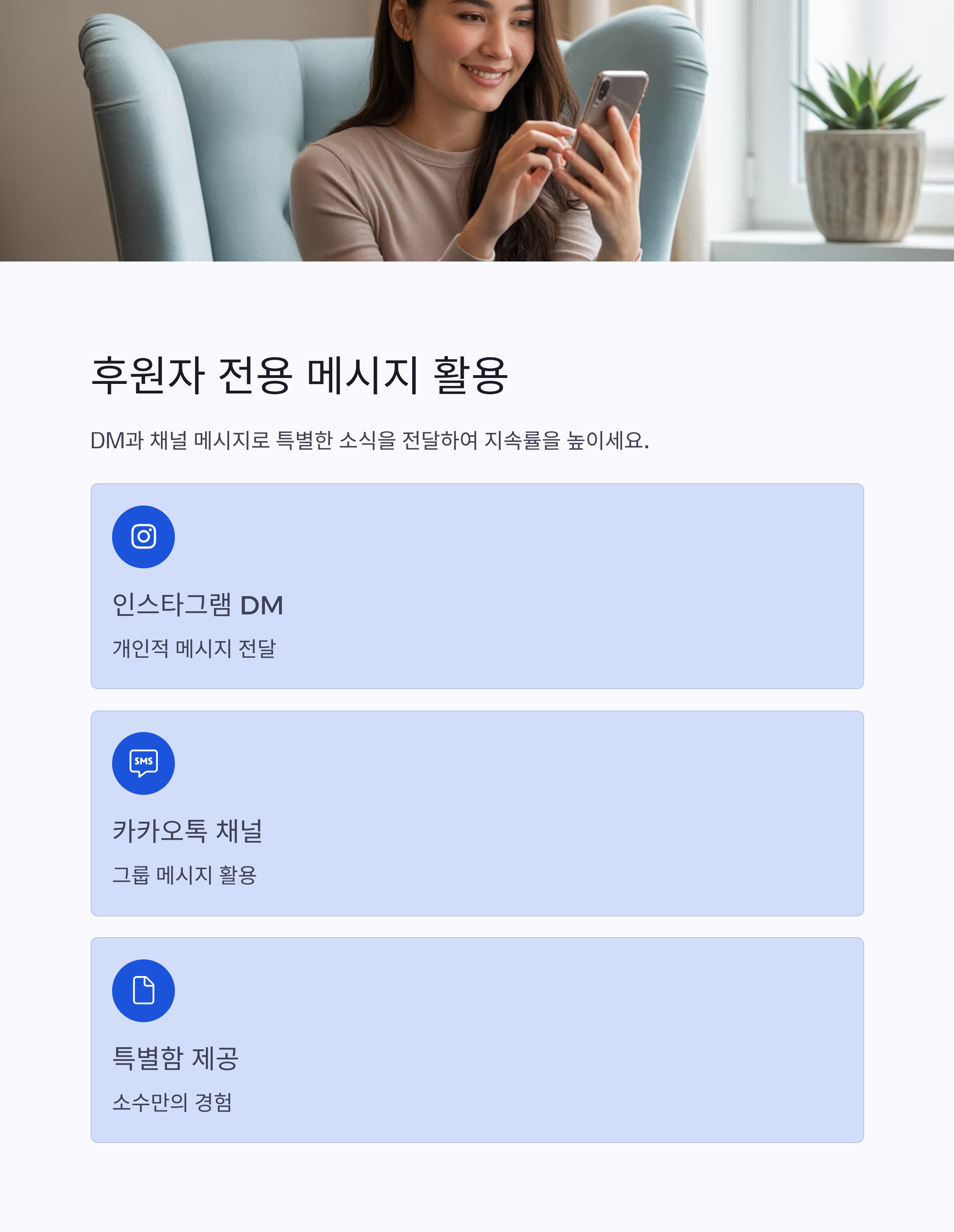 인스타그램 DM, 카카오톡 채널 메시지 등을 통해 후원자에게만 특별한 소식을 전달할 수도 있어요. 소수에게만 공유되는 느낌이 주는 특별함이 후원 지속률을 높여줘요.