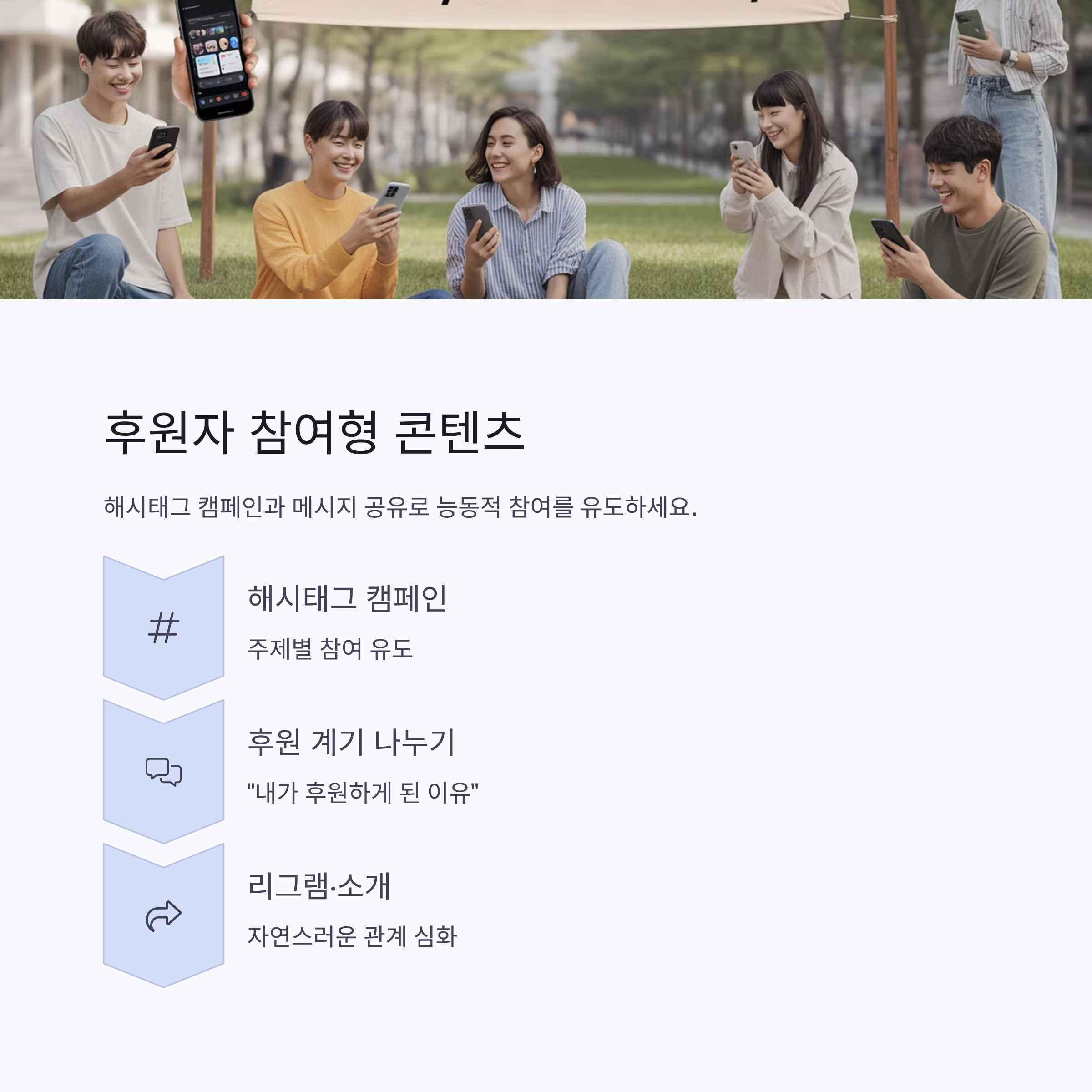 해시태그 캠페인, 기념일 메시지 공유, 후원 계기 나누기 같은 참여형 콘텐츠를 운영하면 후원자가 능동적으로 소통에 참여하게 돼요. 예를 들어 “내가 후원하게 된 이유”를 짧게 올리도록 유도하고, 계정에서 이를 리그램 하거나 소개하면 자연스럽게 관계가 깊어져요.
