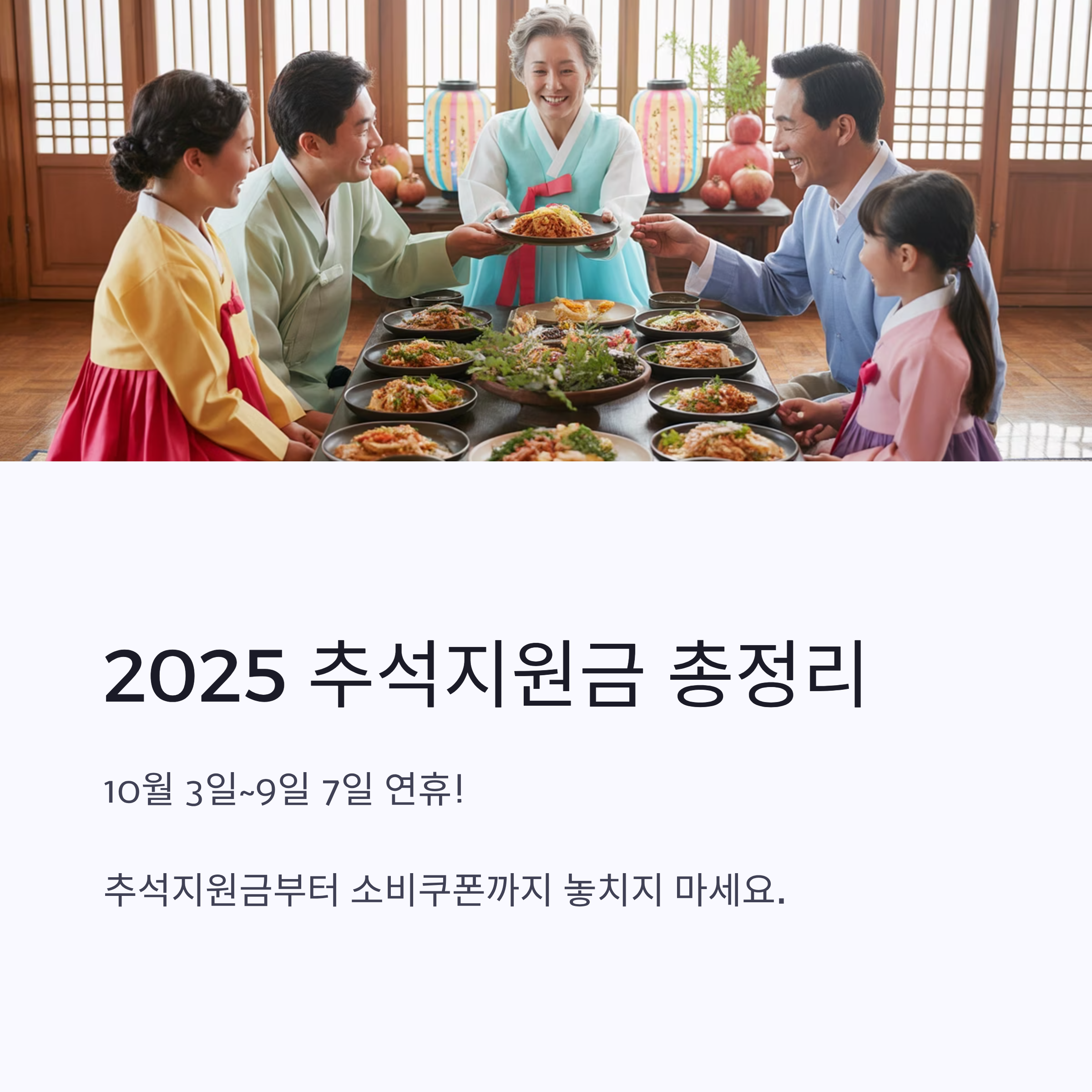다가오는 2025년 추석은 10월 3일 개천절부터 10월 9일 한글날까지 7일 연휴입니다. 여기에 10일 금요일 하루만 연차를 내면 무려 10일간의 황금연휴가 이어지죠. 긴 연휴만큼 많은 분들이 기대하는 건 바로 추석지원금 소식일 텐데요.이번 글에서는 2025 추석지원금 지급 지역과 금액, 신청기간을 정리하고, 함께 챙길 수 있는 소비쿠폰·디지털 온누리상품권·상생페이백까지 알려드립니다.🏖 2025 추석지원금 지급 지역과 금액현재(9월 초 기준) 추석지원금을 지급하는 지자체는 전남 영광, 전남 장흥, 전북 부안, 전북 고창, 전북 정읍시입니다.지역 금액 지급 수단 신청 기간 대상전남 영광군1인 50만 원영광사랑카드9/1~9/7(온라인), 9/8~10/17(오프라인)’24.12.27~신청일까지 주소 둔 군..